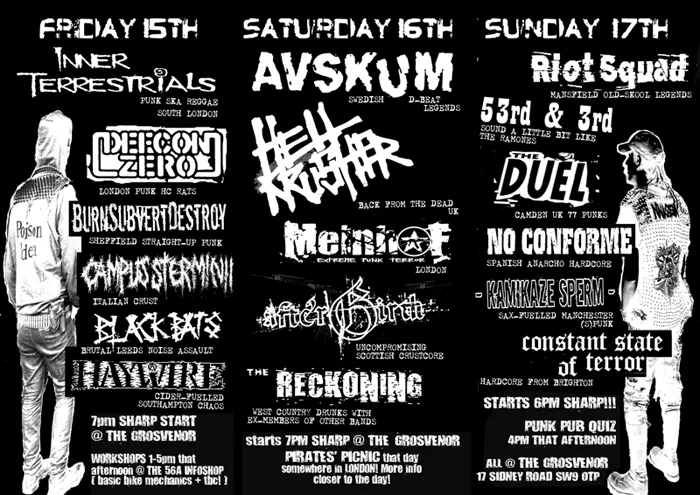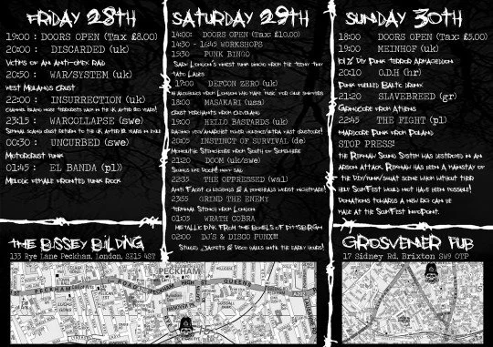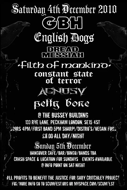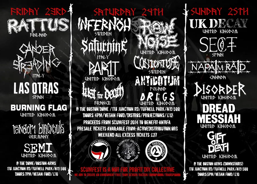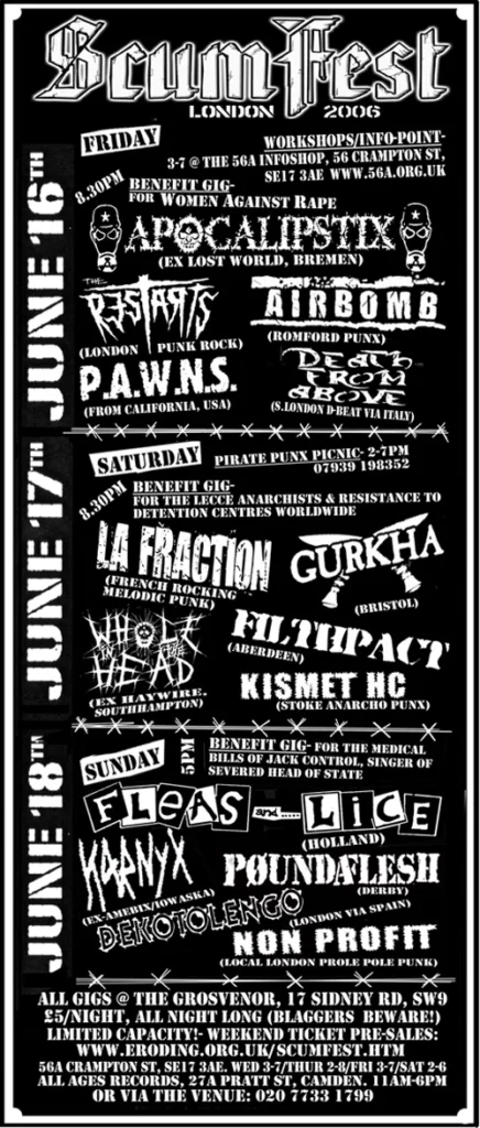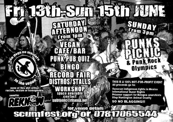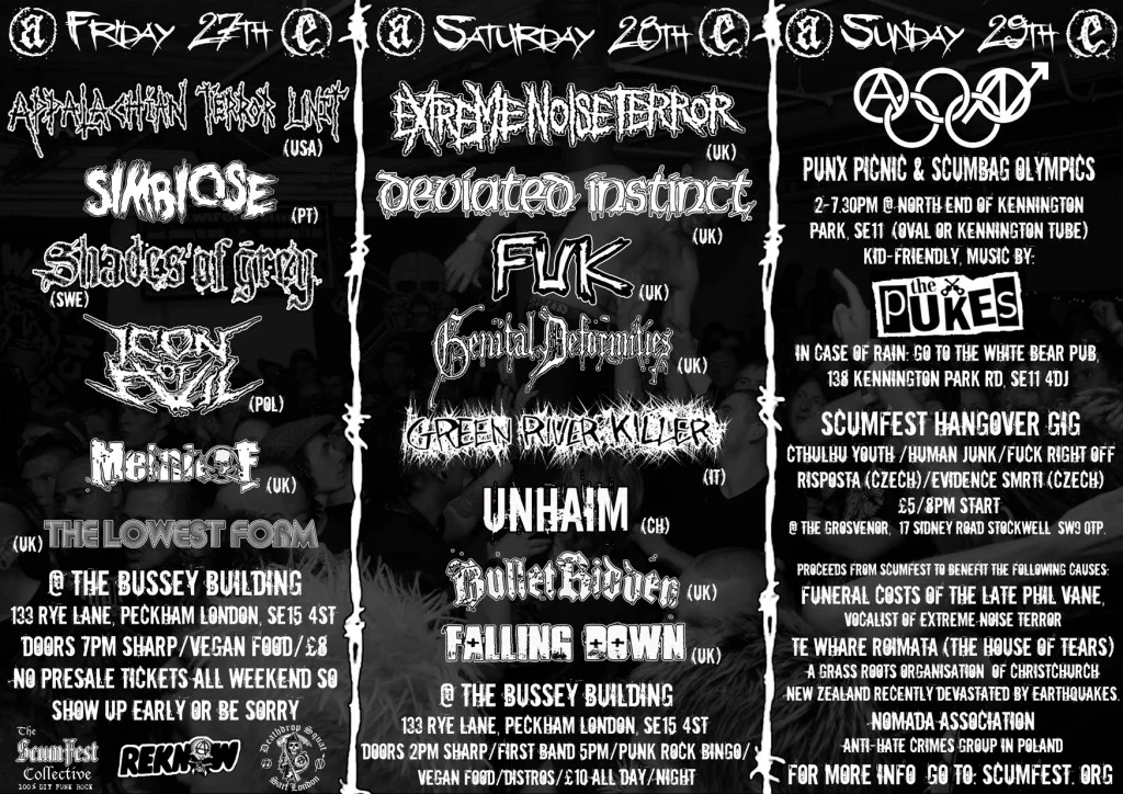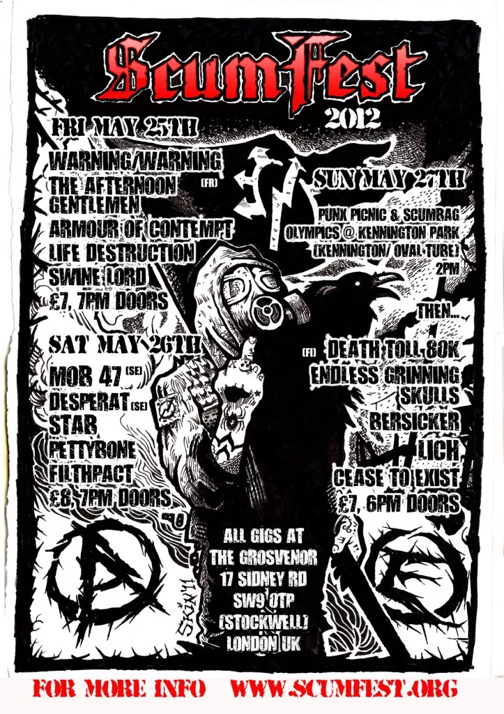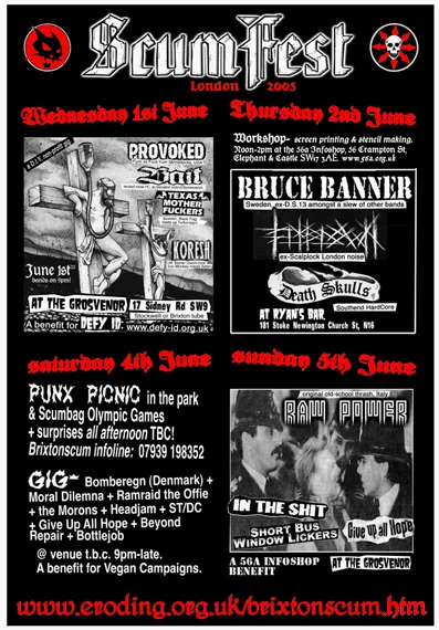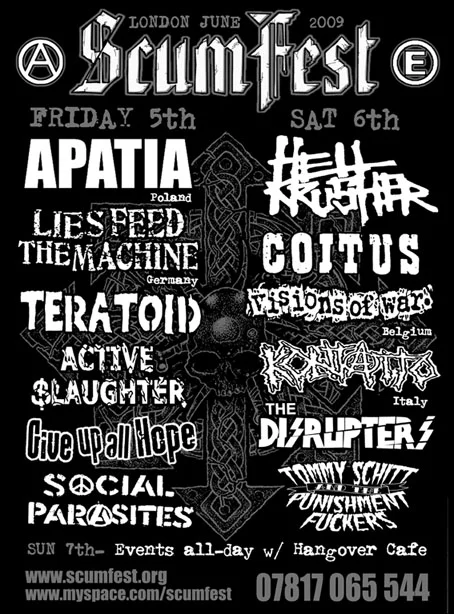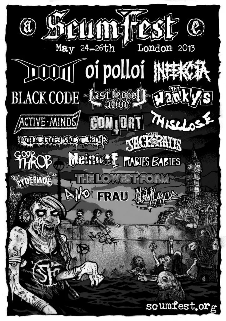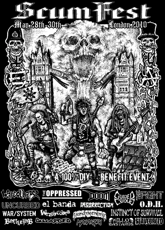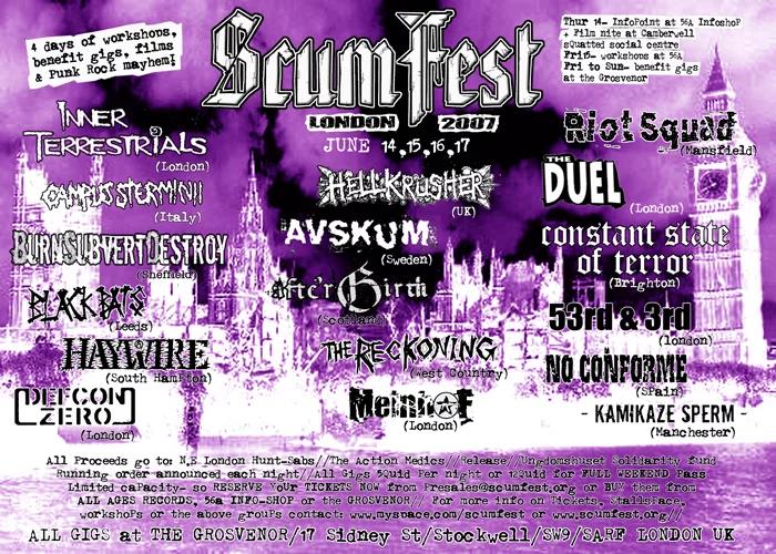 ScumFest was a diy punk rock festival based in London UK that ran from 2005 to 2014. All of the fests were not-for-profit benefits for direct action groups and right-on causes and we raised thousands of pounds for them.