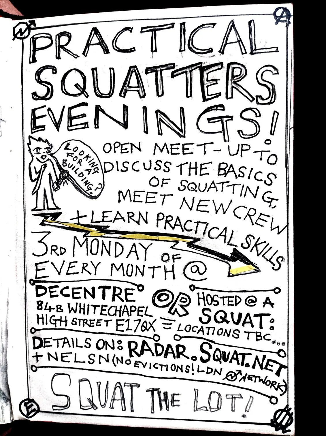 Going forward all Practical Squatters Evenings will take place in a local squat, only using Decentre or other anarchist social centres as backup venues in the case a squat falls through for whatever reason. They will continue to run regularly on the 3rd Monday of the month.