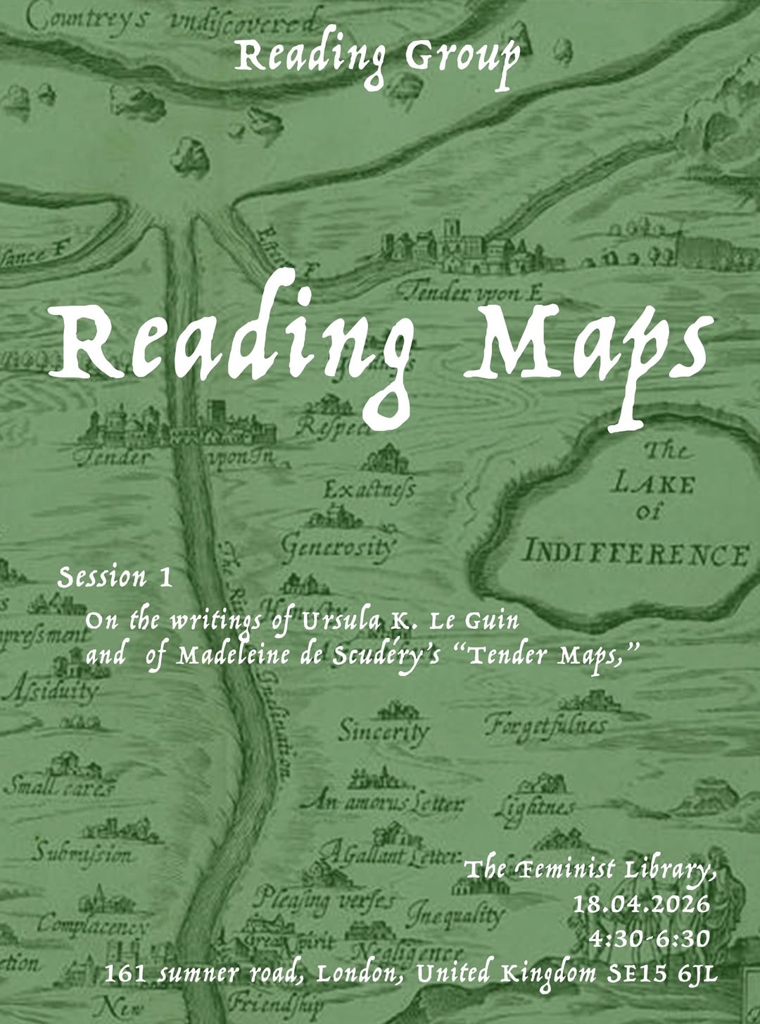 For their first reading group, “Reading Maps,” They will gather us together around texts that approach the practise of cartography not as a tool for fixing territories, but as a speculative and imaginative practice. They’ll read excerpts from The Word for World: The Maps of Ursula K. Le Guin (Architectural Association), placing the work of Ursula K. Le Guin in conversation with Madeleine de Scudéry’s Carte de Tendre from her novel Clélie (1654–61), an early and evocative example of sentimental cartography.