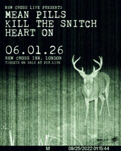 New Cross Live presents Mean Pills UK queer emoviolence https://bellsemoviolence.bandcamp.com/ Kill The Snitch Post-Hardcore band from London https://linktr.ee/killthesnitchband Heart On Punk band in London. Prepare to be let down https://heartonband.bandcamp.com/ Tuesday 6th January 2025 New Cross Inn, London Doors 6pm Tickets £7 ADV STBF https://pit.live/events/mean-pills