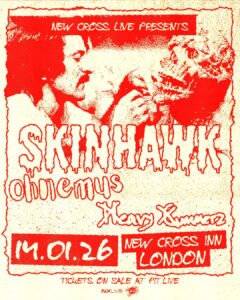New Cross Live Presents Skinhawk Monster punk four piece from Reading. https://open.spotify.com/artist/1dGicHIyl9lakF75qwCXVE Ohnemus New girl band from Birmingham. ” href=”http://www.instagram.com/0hnemus/]” target=”_blank” rel=”noopener”>www.instagram.com/0hnemus/] Heavy Cummerz Heavy Cummerz are a fast paced, Hardcore Punk Rock band from the South East to the North East of London. https://linktr.ee/HeavyCummerz Wednesday 14th January 2026 New Cross Inn Doors 6pm Tickets […]